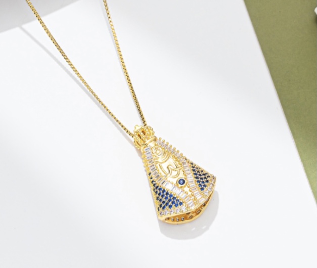 Colar Com imagem de Nossa Senhora Dupla Face, um lado com zirconias cristal e o outro com Zirconias em Azul. cod 72038